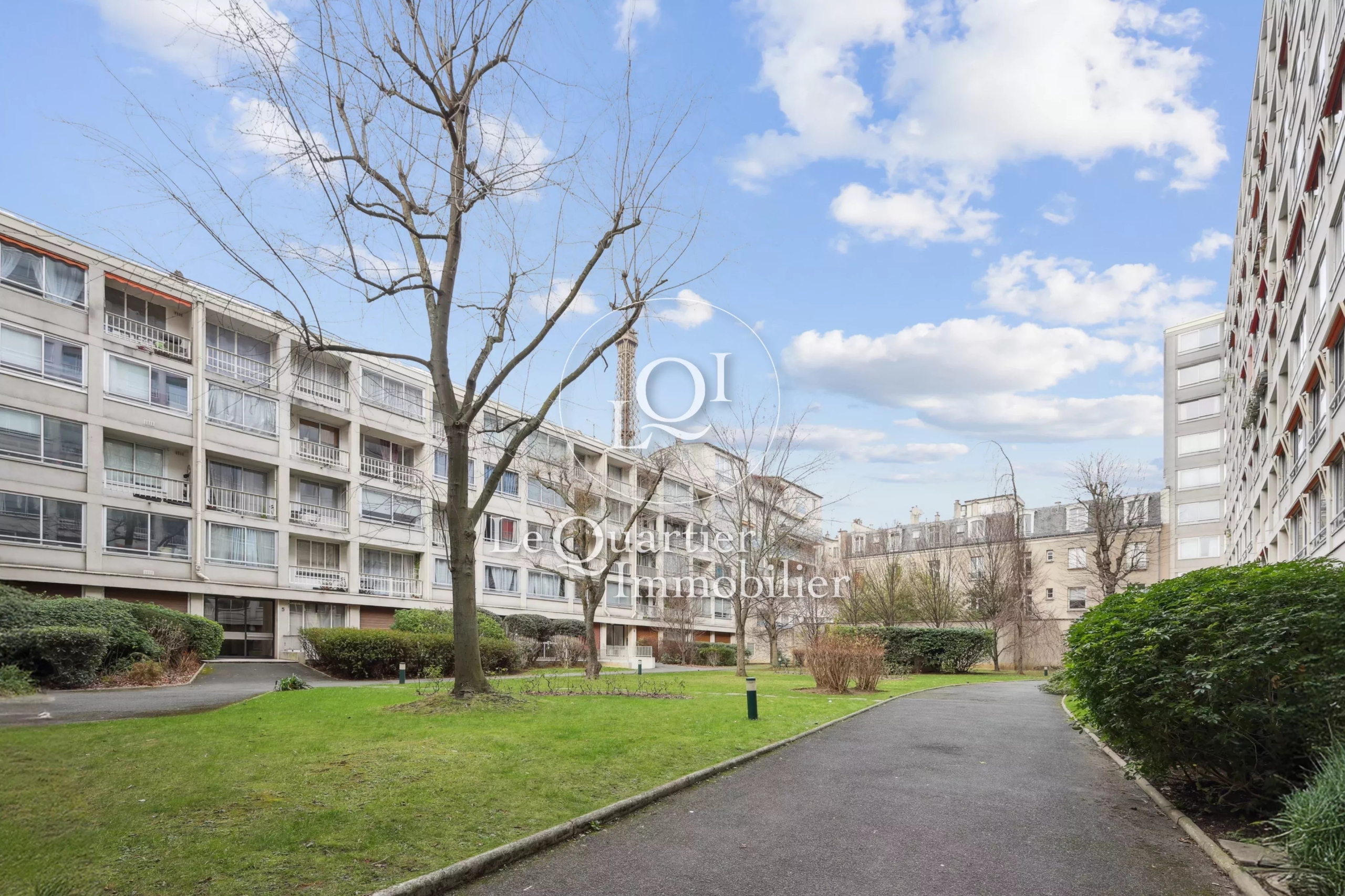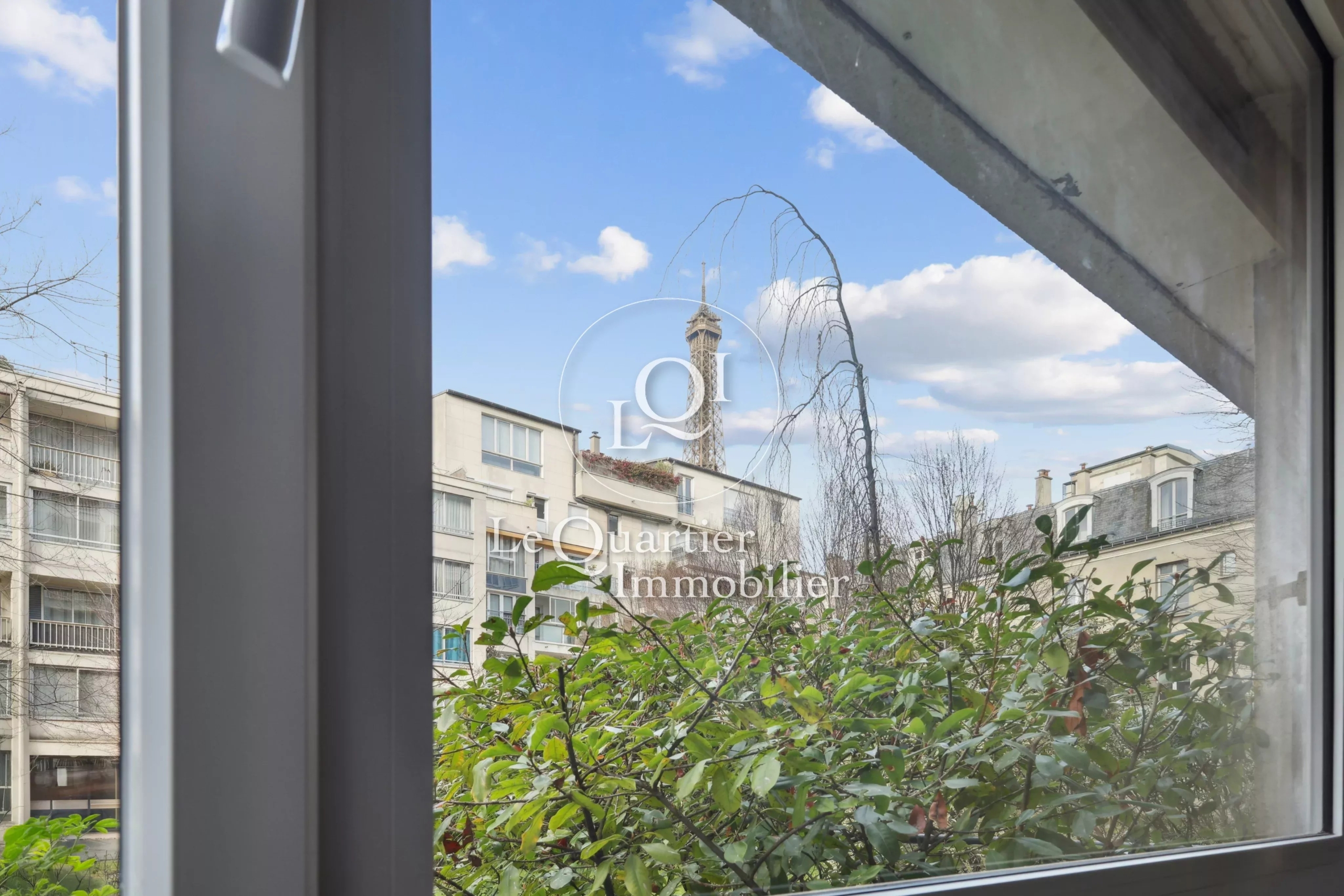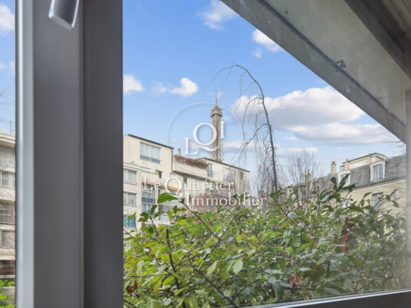La copropriété sécurisée et gardiennée offre une sérénité rare en plein Paris. En toile de fond, la vue sur la Tour Eiffel rappelle chaque jour le privilège de cette adresse unique.