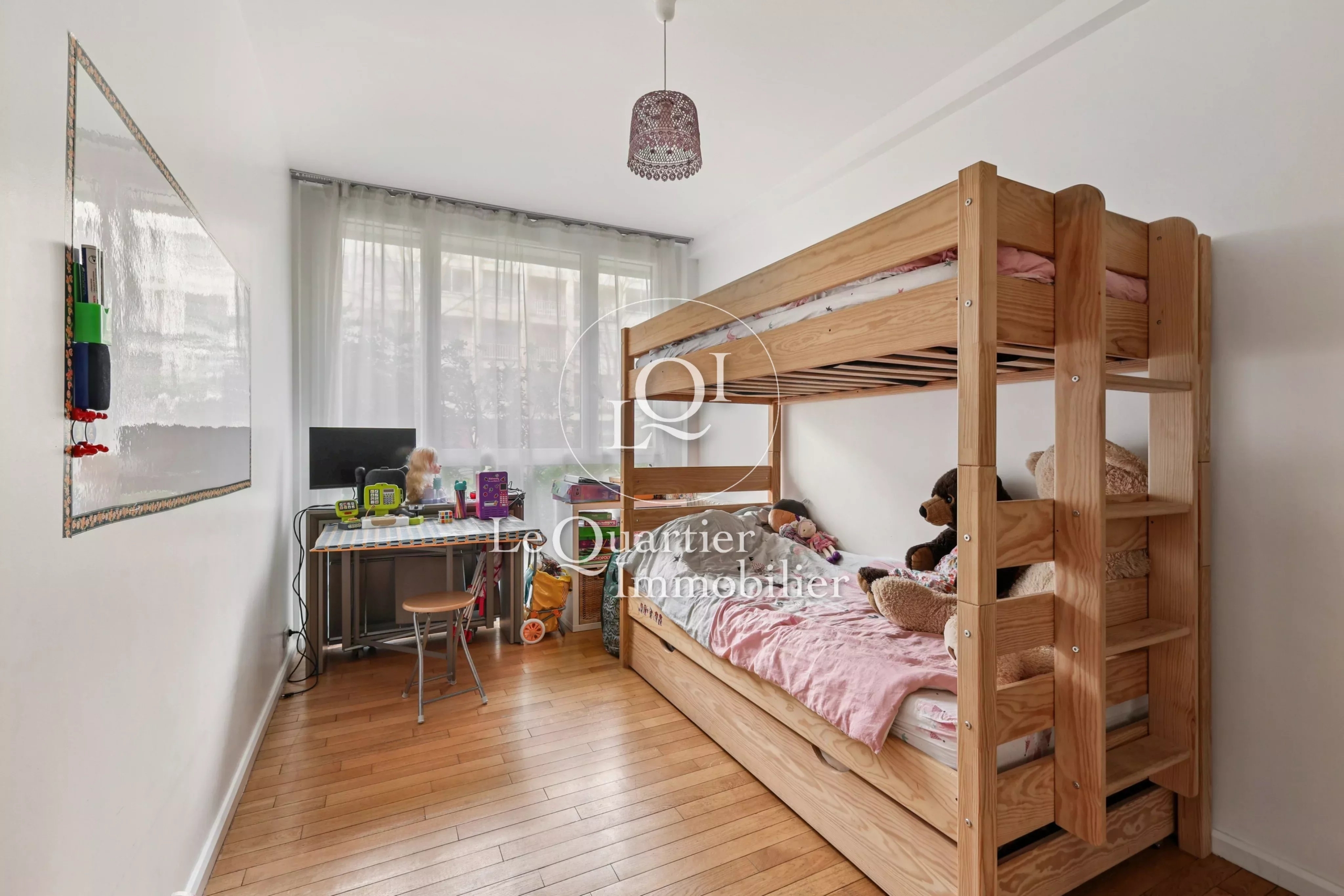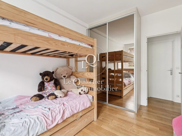 L’espace nuit se compose de deux chambres spacieuses et lumineuses, mises en valeur par un élégant parquet.