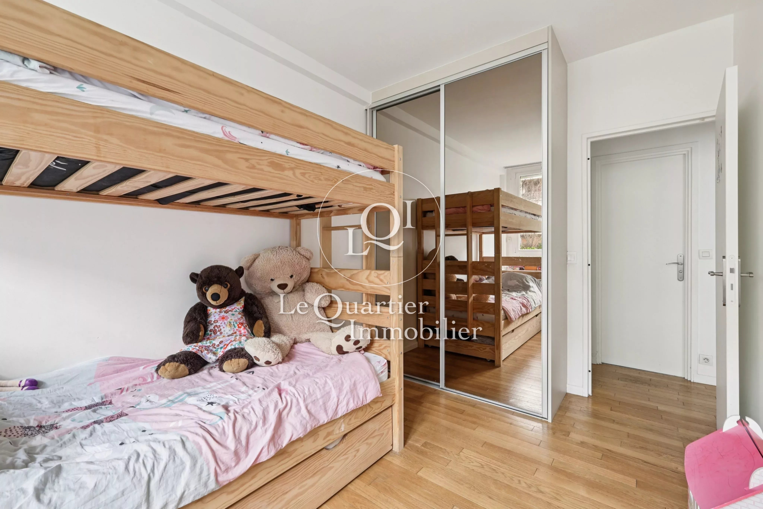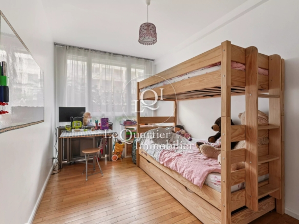 L’espace nuit se compose de deux chambres spacieuses et lumineuses, mises en valeur par un élégant parquet.