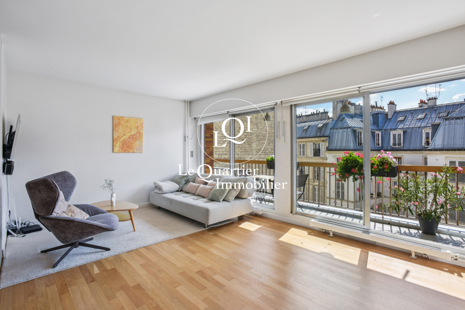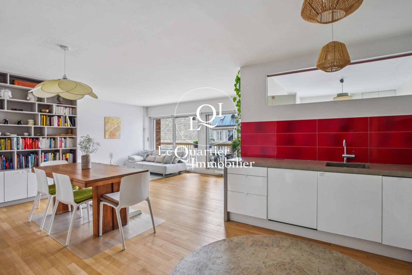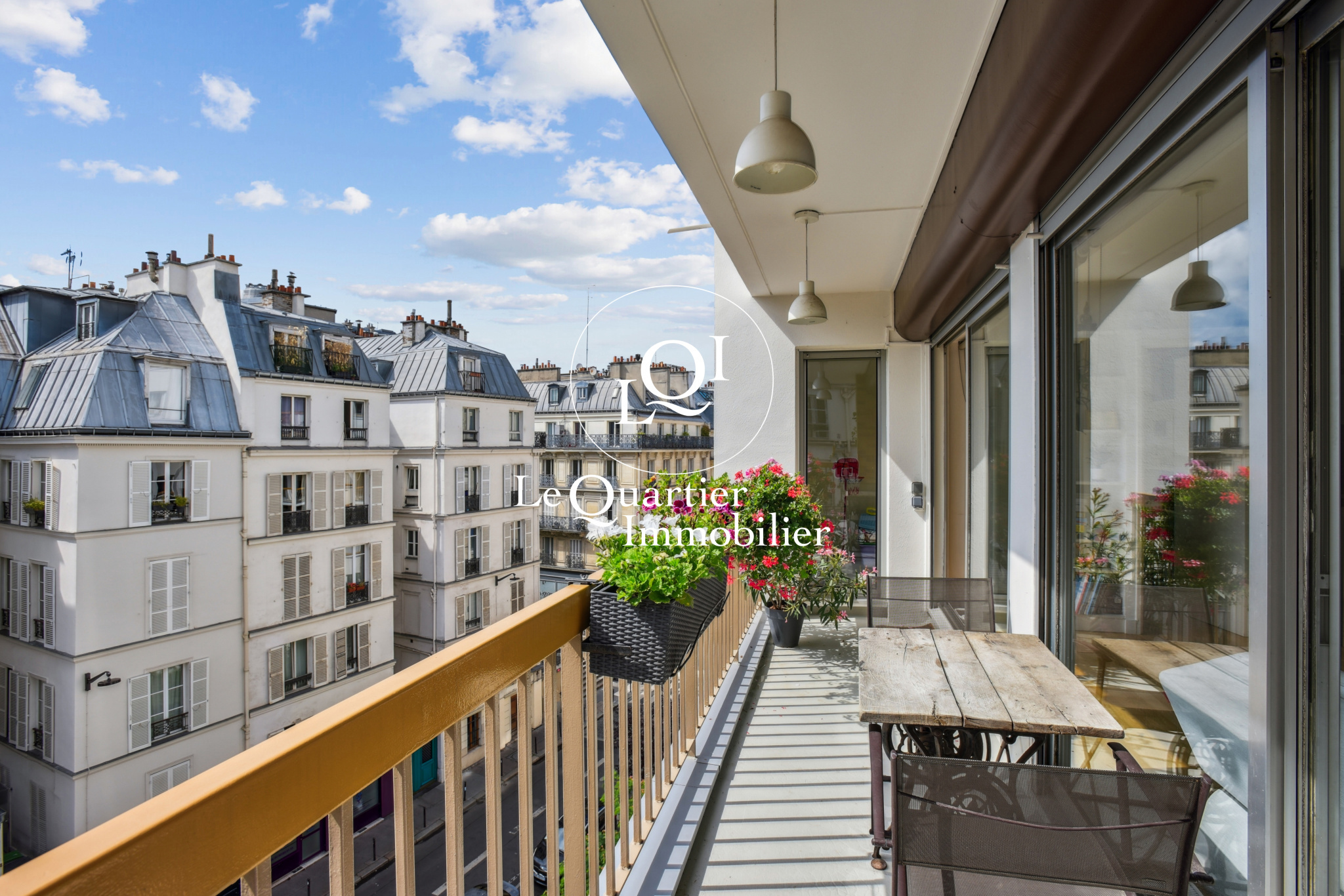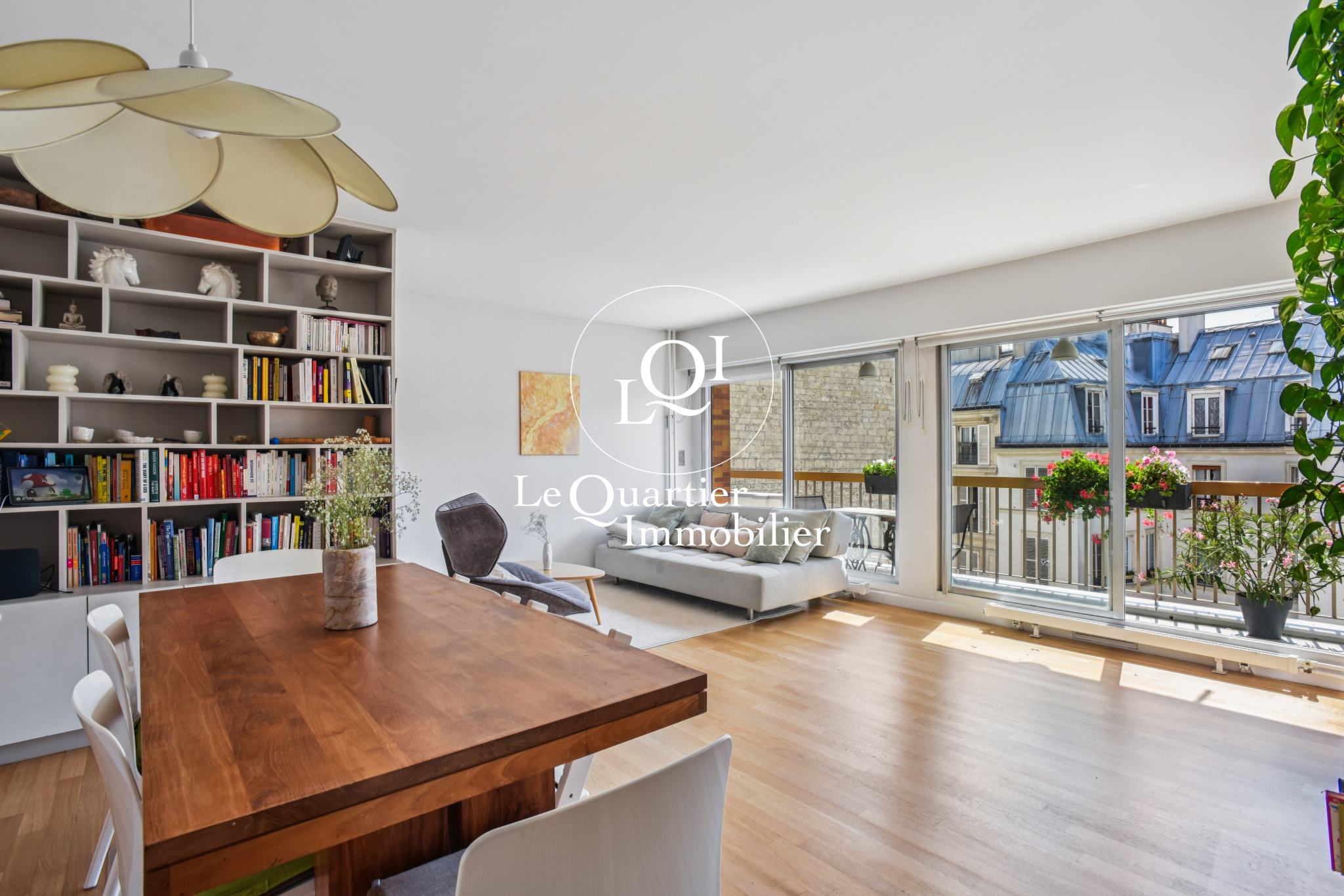 Le cœur du bien s’ouvre sur une pièce de vie spacieuse prolongée par une terrasse filante, parfaite pour un déjeuner ensoleillé ou un dîner aux chandelles face aux toits parisiens.